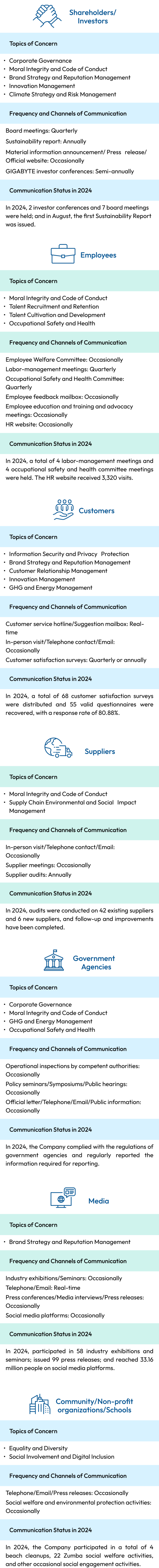 Giga Computing referred to the AA1000 Stakeholder Engagement Standard 2015 for stakeholder identification and, based on past experience and industry characteristics, has selected 7 categories of stakeholders, including shareholders/investors, employees, customers, suppliers, government agencies, media, and community/NPOs/schools. Giga Computing is progressively establishing and improving various communication channels for different stakeholders, aiming to understand the topics of concern to each group. This ensures that company information is transparent and accurately responds to all groups affected by the Company's operations.