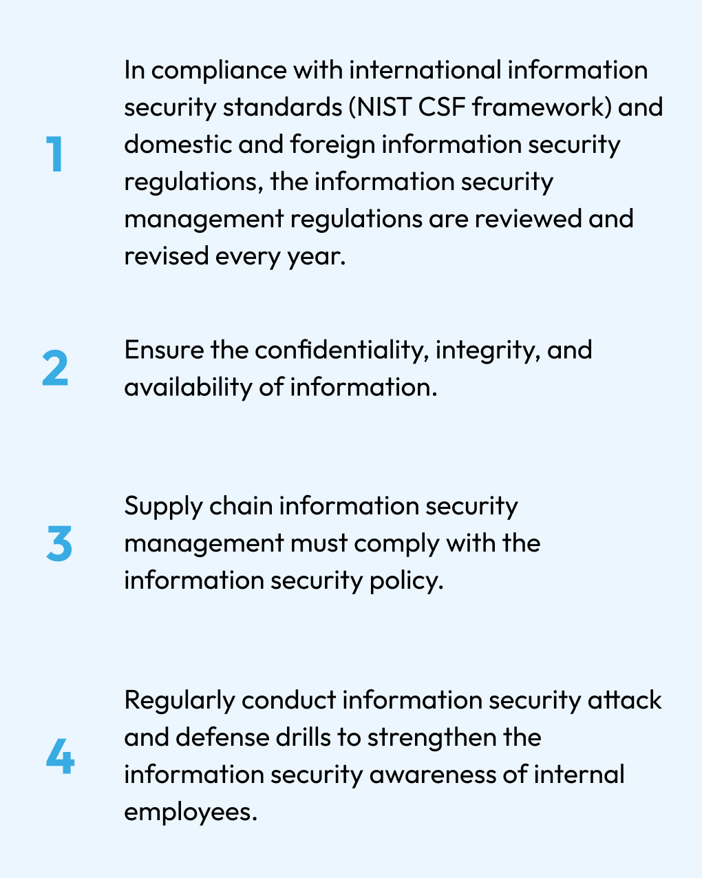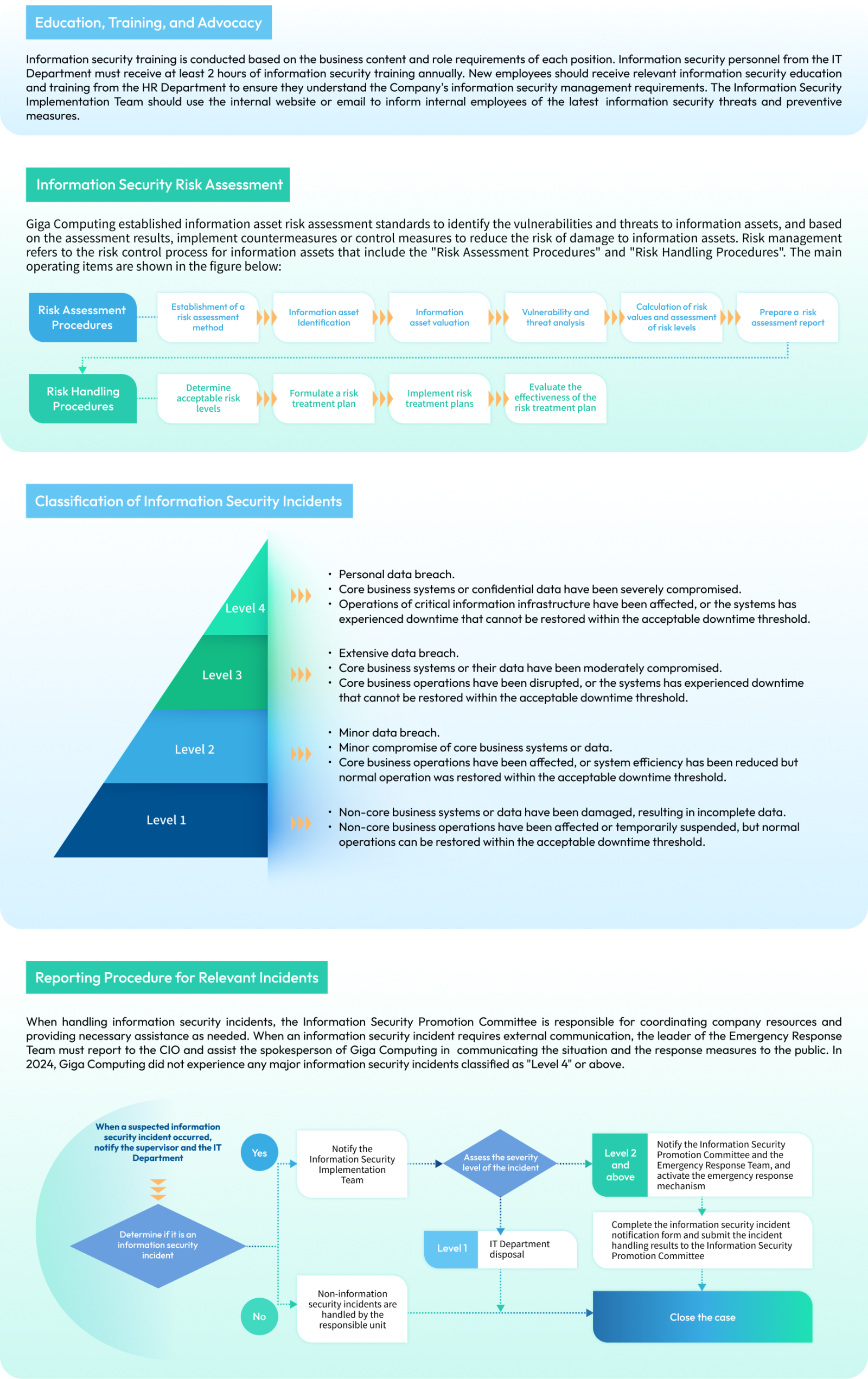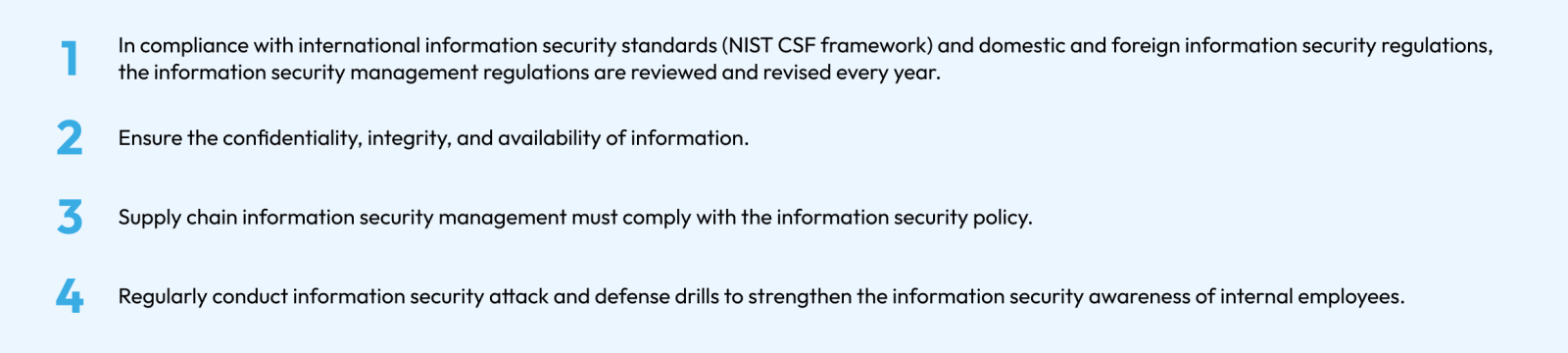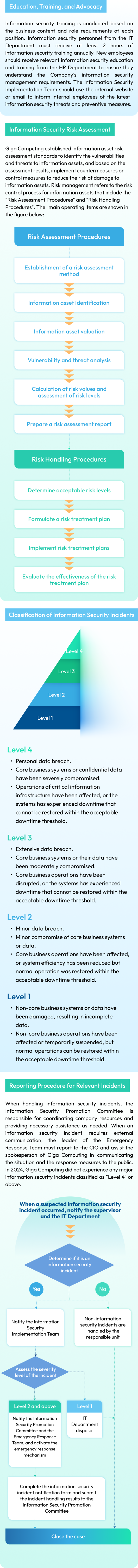 The Information Technology Division is responsible for formulating information security policies, risk assessment, and implementation and follow-up of countermeasures. The CIO reports the implementation status to the General Manager occasionally every year. In order to reduce the risk of non-compliance and increase customer trust, we have also introduced the ISO 27001 information security management system to establish a comprehensive and systematic approach to managing and protecting the Company's information assets.